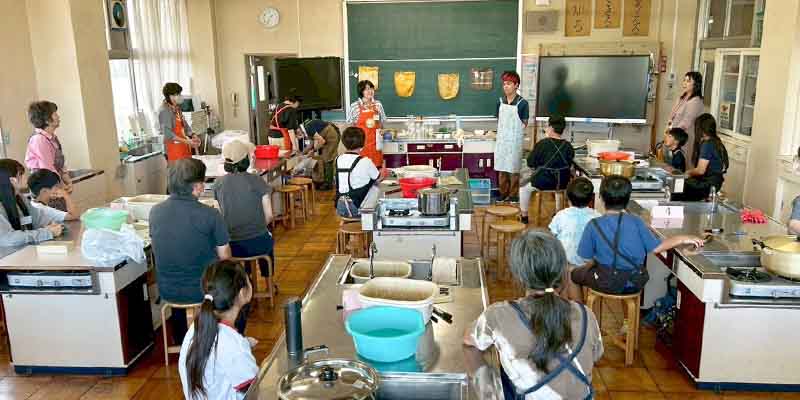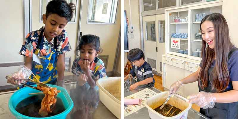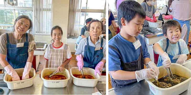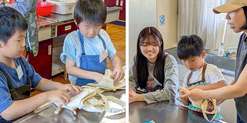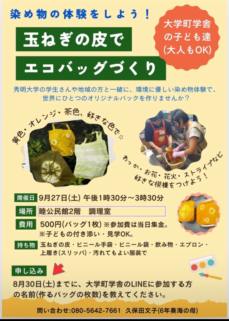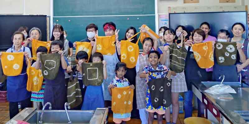 「大学町学舎」に通う小学生と保護者8組12名が、玉ねぎの皮を使った草木染めを楽しく学んで、手作りのエコバッグを持ち帰りました。