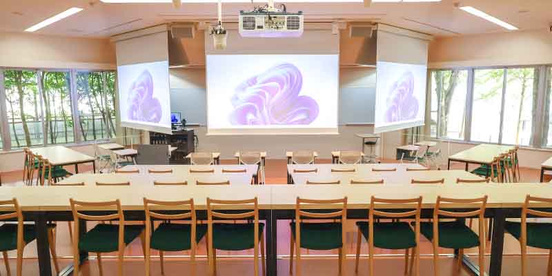 提示用モニターとして、3台のプロジェクターが設置され、教室のどこにいても、資料をしっかり見て学ぶことができます。