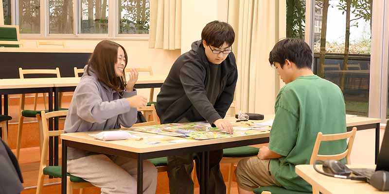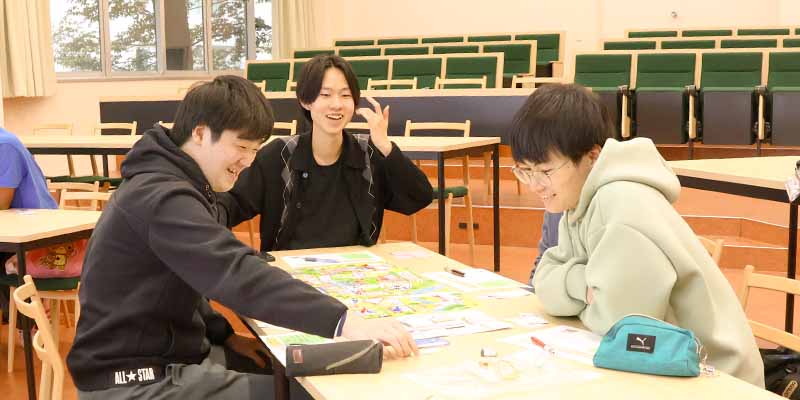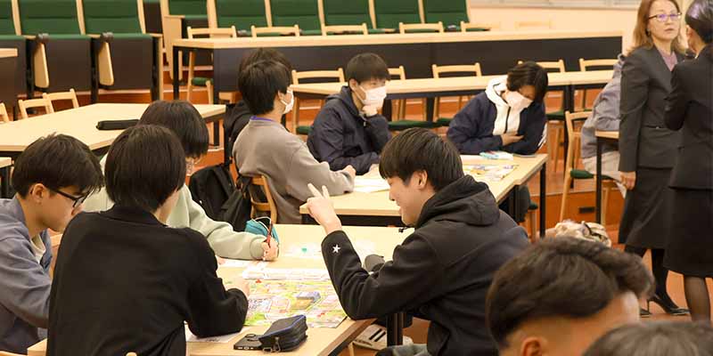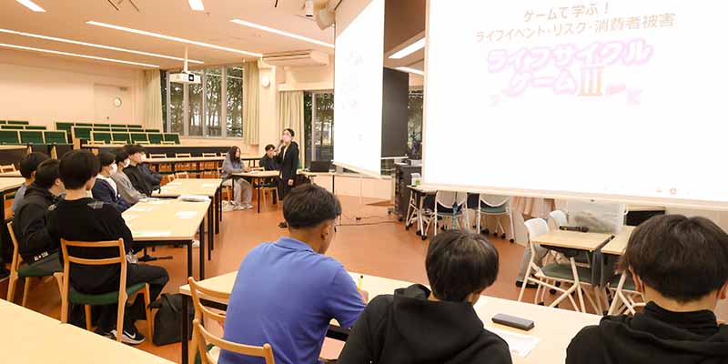学生たちは3、4名のグループをつくり、「すごろく形式」でゲームを楽しみながら、結婚・住宅購入などのライフイベントや病気・ケガ、詐欺被害等人生のさまざまなリスクとそれらに対する必要な知識や備え、消費者として知っておくべき知識とその対策などを学びました。