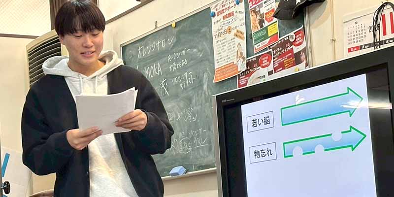 講座の前半では、認知症の基礎知識や症状の特徴、接し方のポイントなどを学生が丁寧に解説しました。