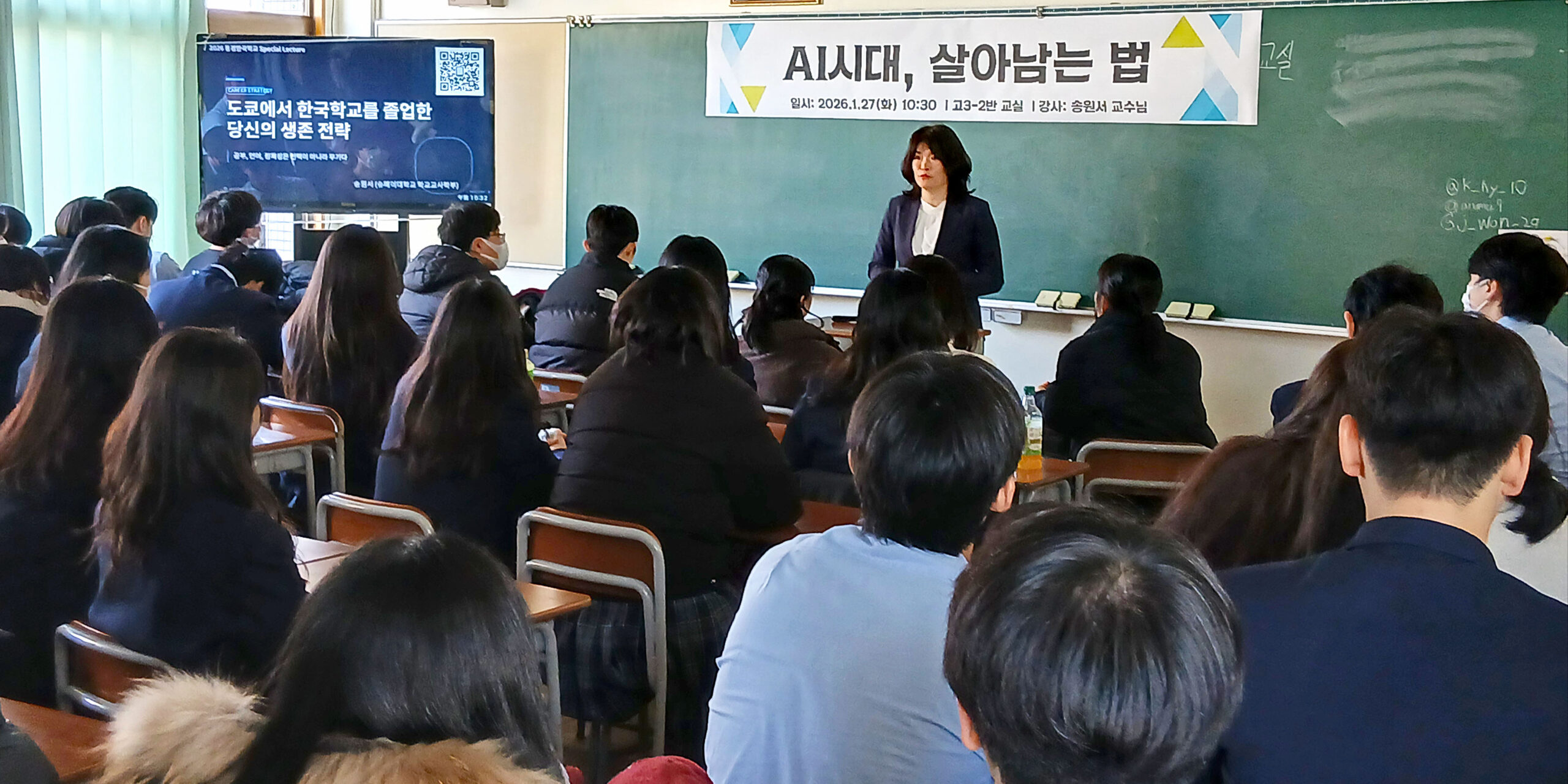 東京韓国学校にて、本学学校教師学部のソン専任講師が、卒業を控えた高校3年生に特別講演を行いました。テーマは「AI時代における生存戦略」。進学・就職・社会進出を目前に控えた生徒たちに向けて、学びの重要性や将来に向けた準備について具体的な考え方が示されました。ソン専任講師は、急速に進化するAI技術の時代においても、最終的な判断や責任を担うのは人間であり、その基盤となるのが知識と継続的な学習であると強調しました。また、東京韓国学校で培われた韓国語と日本語の運用力、ならびに二つの文化を理解する視点は、将来において大きな強みとなる貴重な資産であると述べました。
