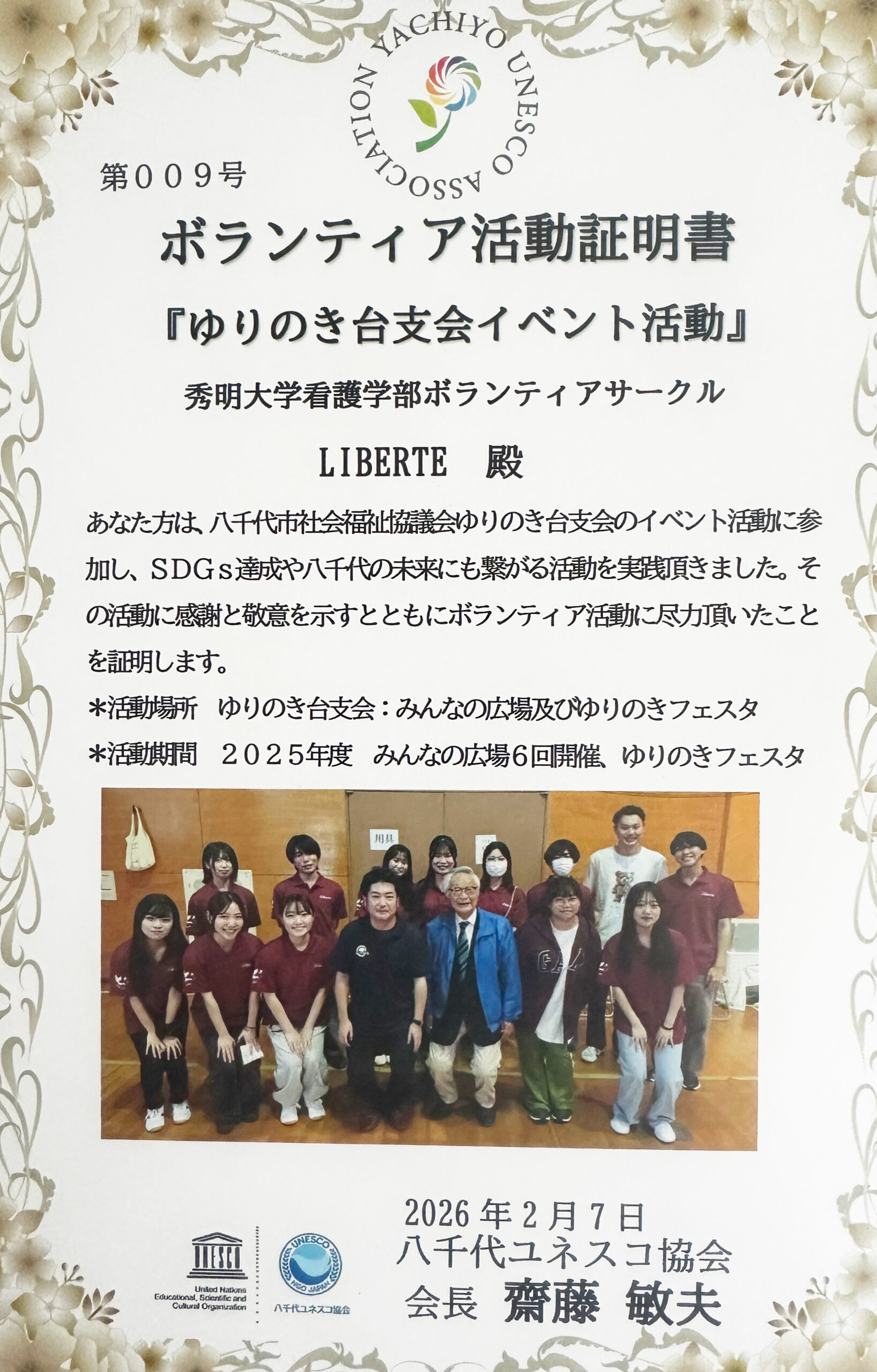 本学ボランティアサークル「LIBERTÉ」は、八千代市社会福祉協議会ゆりのき台支会の活動に継続的に参加し、地域社会に根ざした実践的なボランティア活動に取り組んでまいりました。これらの取り組みが、SDGs(持続可能な開発目標)の達成に寄与するとともに、八千代市の未来につながる活動として高く評価され、八千代ユネスコ協会より「ボランティア活動証明書」を授与されました。