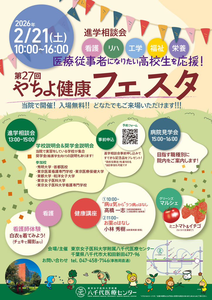 本学看護学部の実習先である八千代医療センターにて、「第27回やちよ健康フェスタ」が開催されます。当日はさまざまな催し物が企画されており、本学も進学相談会を実施いたします。相談会では、在学生も参加しリアルな学生生活をご紹介!進学に関する疑問や不安にお答えします。この機会にぜひ足をお運びください。本学は、医療従事者を目指す高校生の夢を全力で応援します!